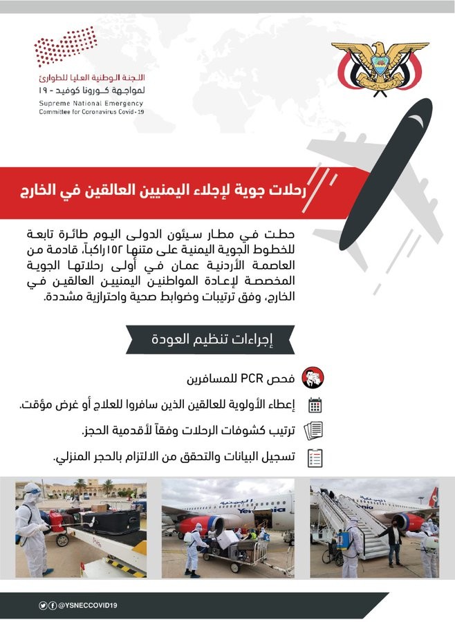 إنفوجرافيك | الحكومة تبدأ تسيير سلسلة رحلات جوية لإعادة اليمنيين العالقين في الخارج 2020-05-29 اللجنة الوطنية العليا لمواجهة كورونا انفوجرافيك